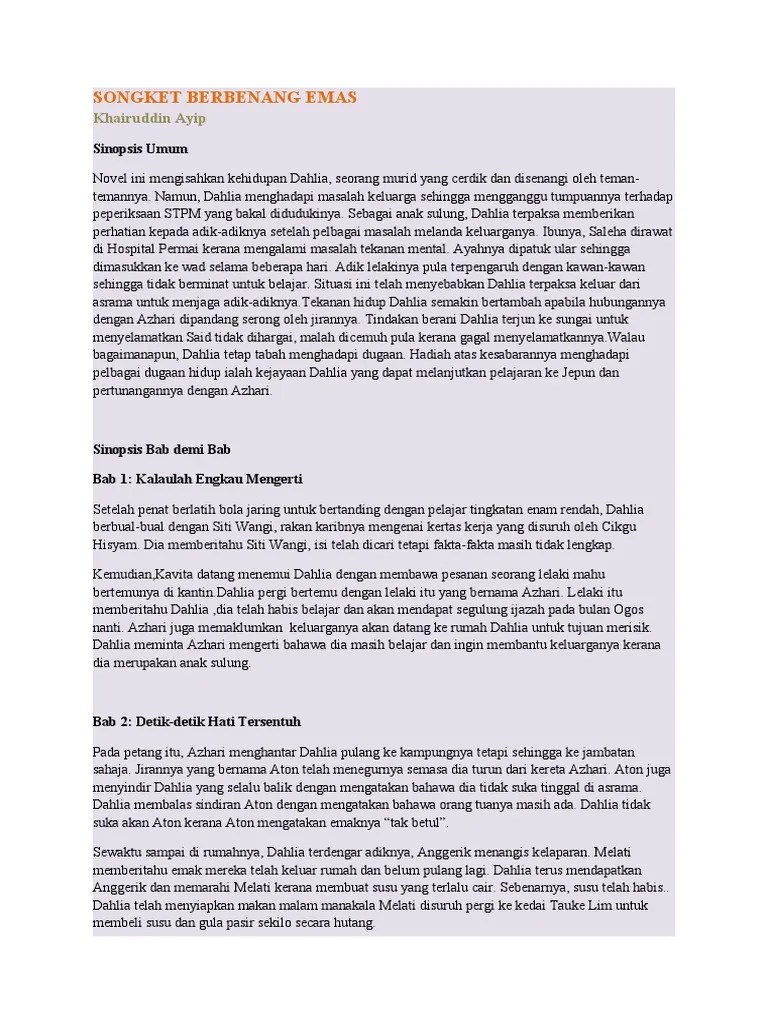 Novel songket berbenang emas : Sinopsis, tema, persoalan, nilai & pengajaran novel tingkatan 5. Sinopsis bab demi bab, sinopsis keseluruhan, tema, persoalan, watak dan perwatakan, latar masa, latar tempat, latar masyarakat, binaan plot, . Novel "songket berbenang emas" bertemakan kegigihan. Sinopsis novel songket berbenang emas 'bab demi bab' karya khairuddin ayib. Semasa memotong kelapa sawit di parit haji kadir, embong dibelit ular sawa tetapi dia dapat menyelamatkan diri.